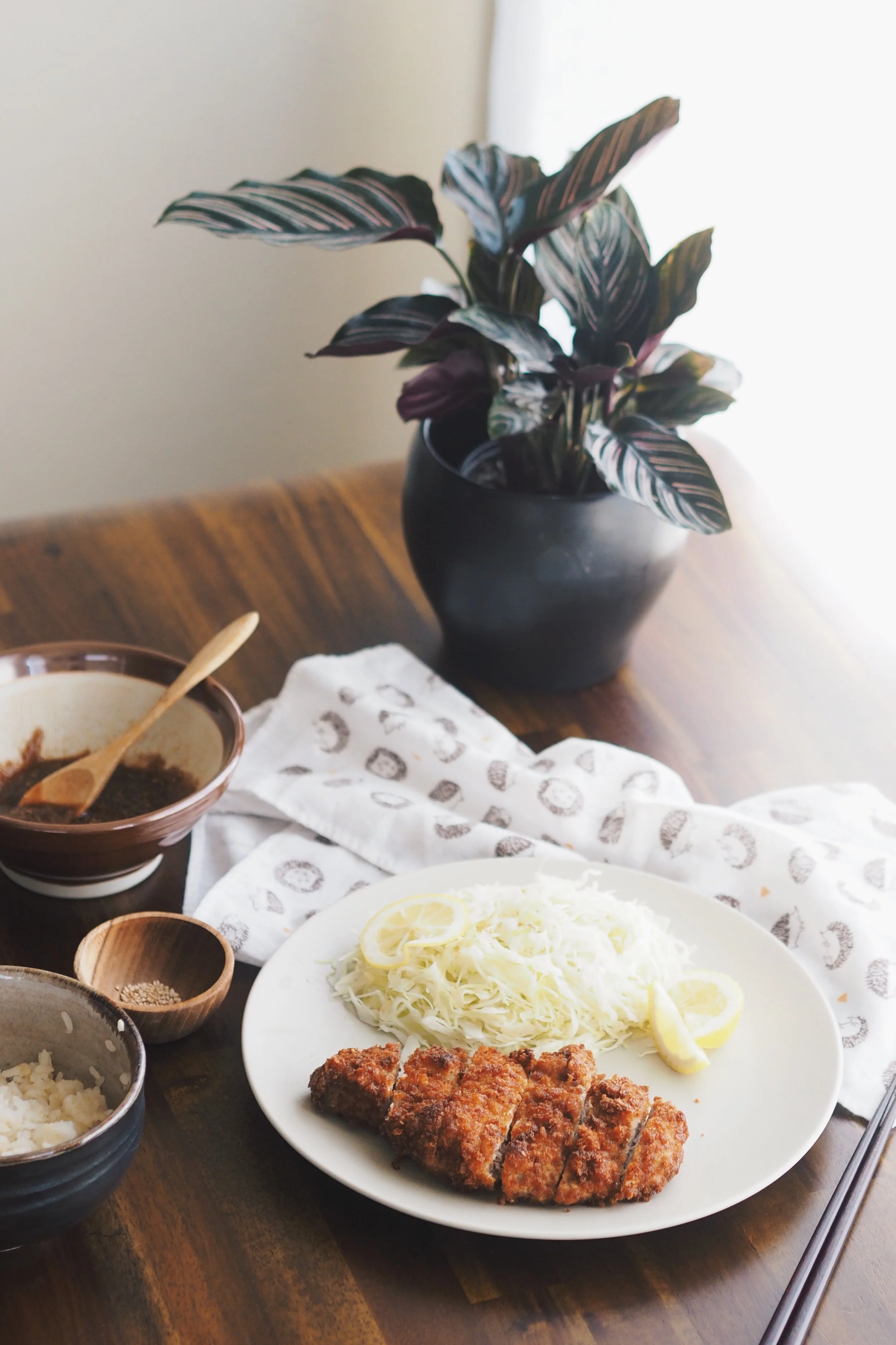 Cut the tonkatsu into 5 to 6 pieces by pressing the knife directly down instead of moving back and forth. This way, the breading will not come off. Transfer to the plate with the cabbage salad and serve immediately with a bowl of steamed rice, sesame katsu sauce, and hot mustard paste.